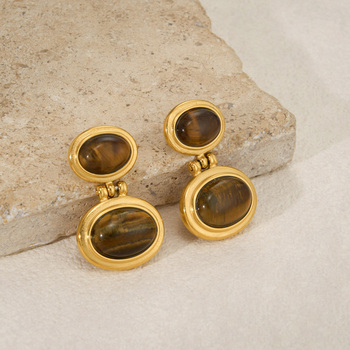 Dazan New 18K Chapado en oro Hipoalergénico Acero inoxidable Vintage Oval Brown Natural Stone Stud Pendientes Fancy Indian Jewelry